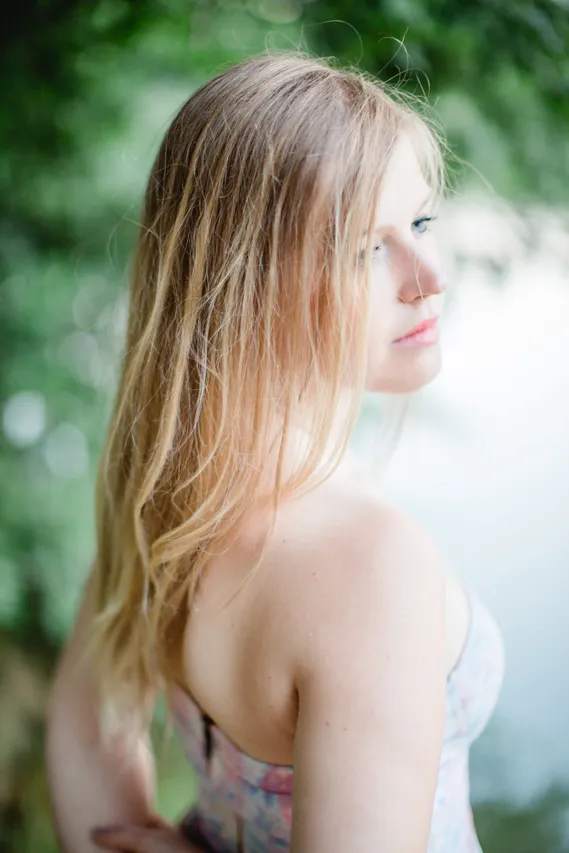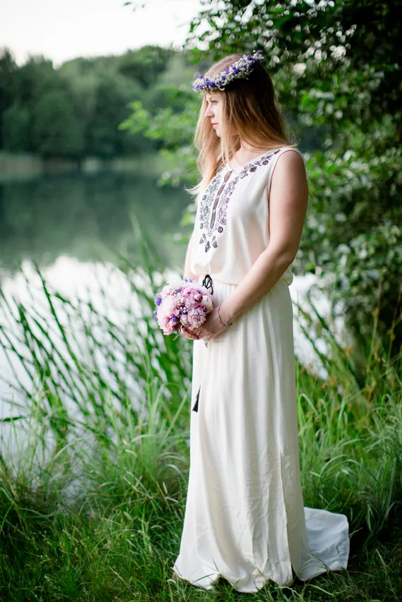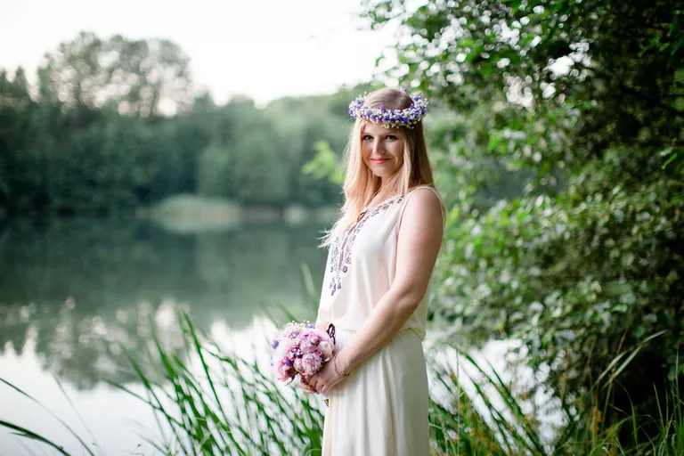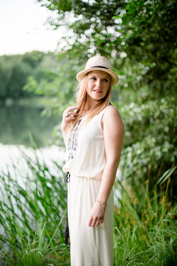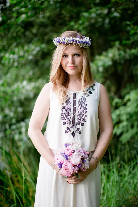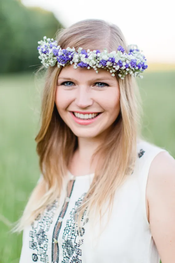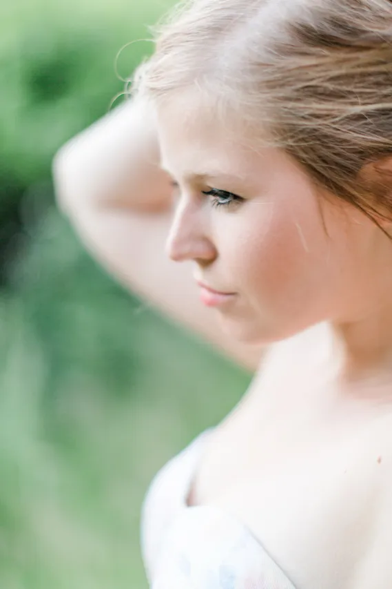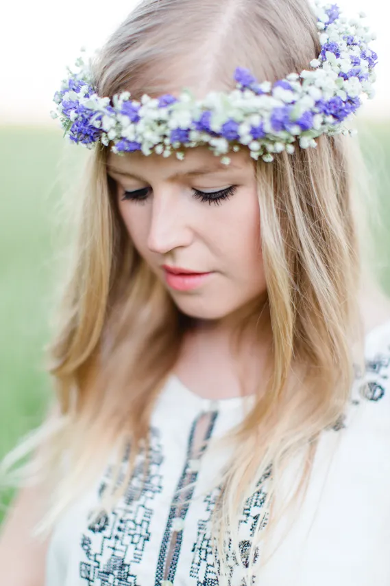 Dieses Shooting war etwas Besonderes, denn diesmal standen meine Ideen und Vorstellungen im Vordergrund. Mein Modell Anne hat sich glücklicherweise ganz darauf eingelassen. So organisierte ich die Garderobe und diverse Accessoires. Beim Floristen besorgte ich Lavendel und Schleierkraut, was ich selbst zu einem Blumenkranz gebunden habe. Außerdem habe ich mich an einem kompakten Blumenstrauß aus Pfingstrosen versucht, der wirklich wunderschön geworden ist. Wir haben dann drei Outfits zusammengestellt und waren an einem warmen Sommerabend im Umland von Mittweida unterwegs.