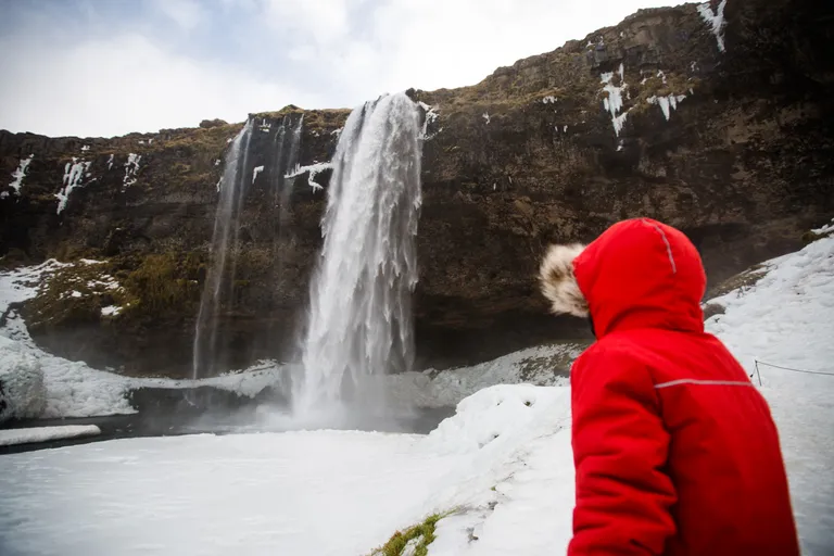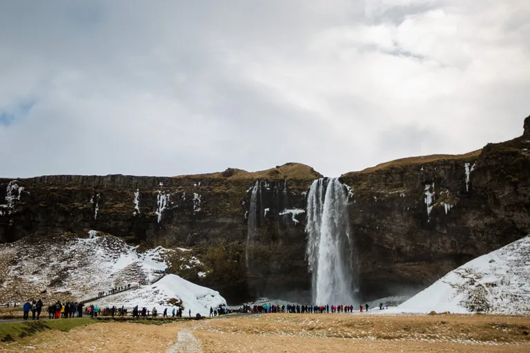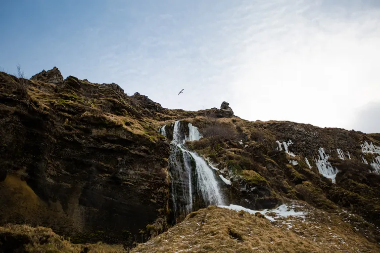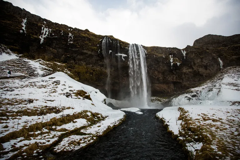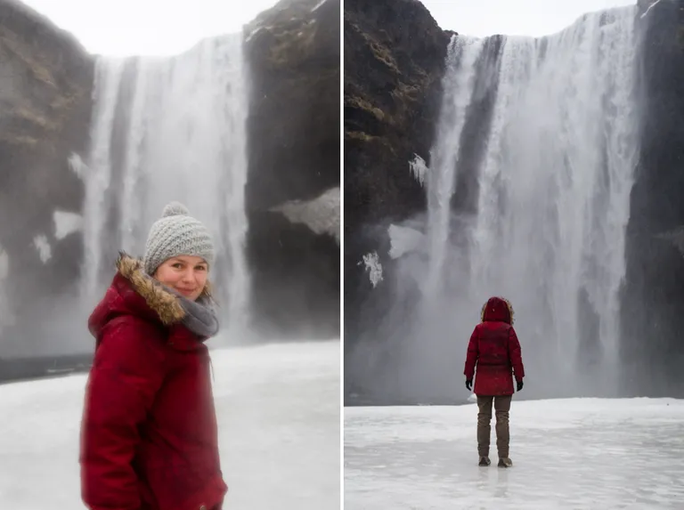 Nächstes Ziel war der Wasserfall Seljalandsfoss. Das Wasser stürzt hier über 66 Meter tief in einen kleinen See. Im Sommer gibt es mehrere Pfade neben und hinter den Wasserfall zu gelangen. Gleich daneben liegt der Wasserfall Gljúfurárfoss. Das besondere ist hier, dass man nur durch einen Felsspalt zu ihm gelangt. Es war wirklich sehr nass und glatt. Unbedingt Gummistiefel, Spikes und Mut mitbringen. Ich habe mich nicht getraut.