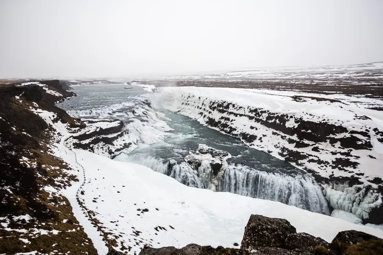 Das Wetter wurde schlechter und bei Dauerregen erreichten wir den Wasserfall Gullfoss. Ein kurzer Spaziergang bis zur Aussichtsplattform und ein Foto mussten reichen.