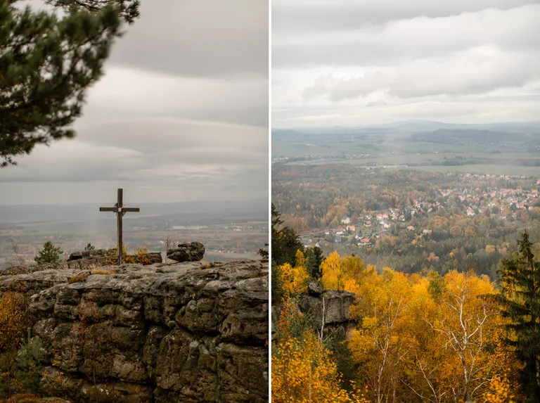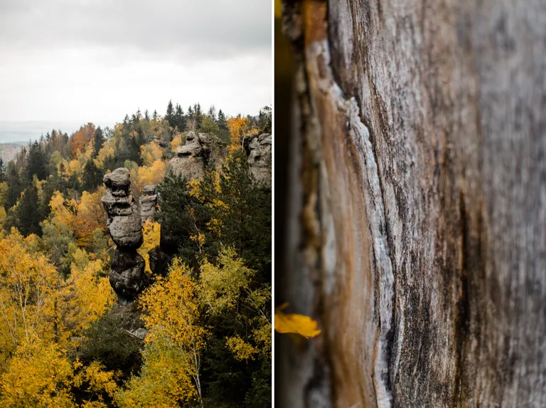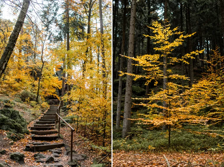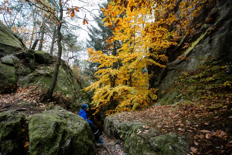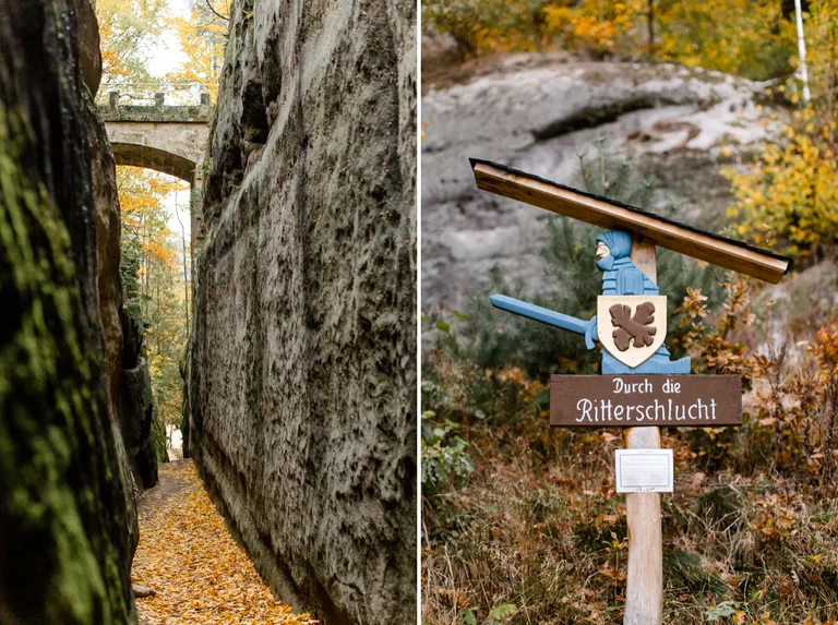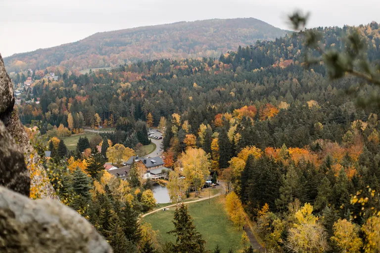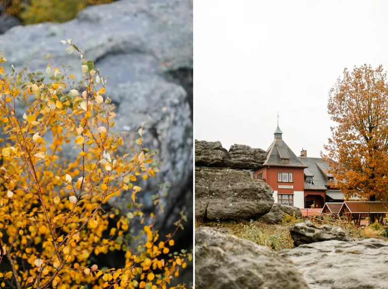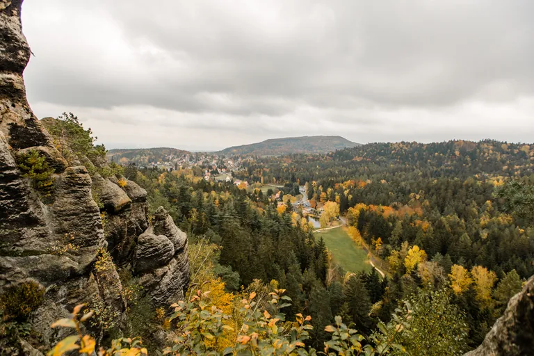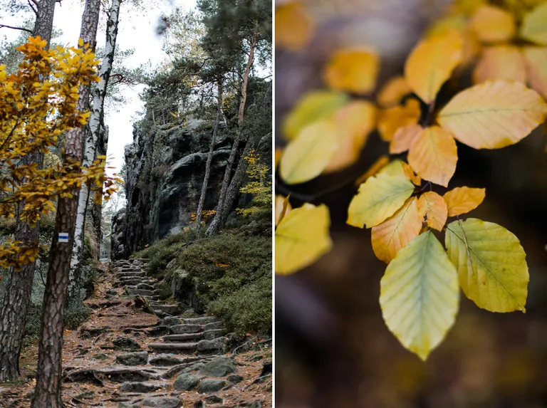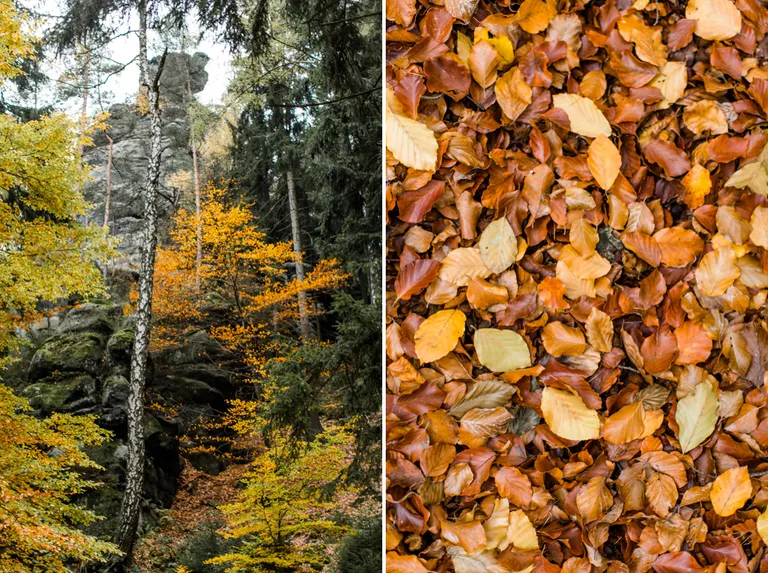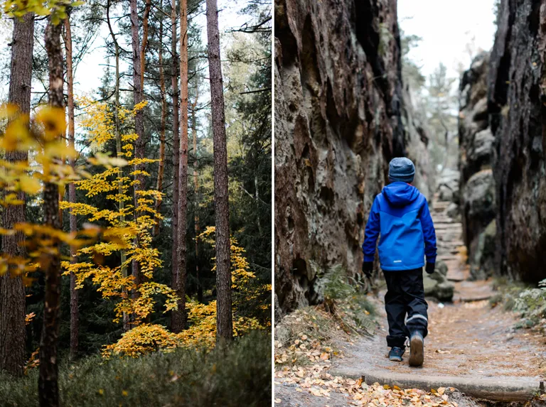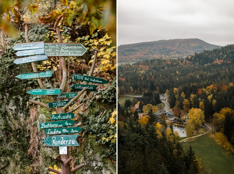 Wir schnürten unsere Wanderschuhe und liefen direkt vor der Haustür los. Durch die Zigeunerwand ging es weiter hoch zum Nonnenfelsen mit einem fantastischen Blick über Jonsdorf. Die Laubfärbung war besonders prächtig und immer wieder blitzten im dunklen Wald gelb gefärbte Blätter hervor. Weiter ging es ein Stück am Grenzweg entlang, ein Abstecher zu den Orgel-Pfeifen-Steinen (Sandstein in Säulenform der durch glühende Lava entstanden ist) und zum Gondelteich in Jonsdorf.