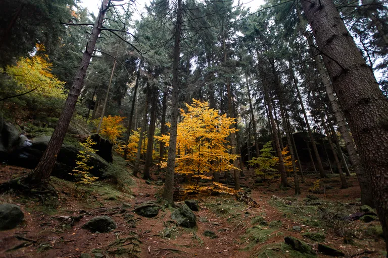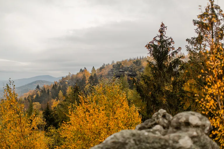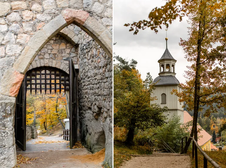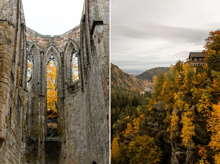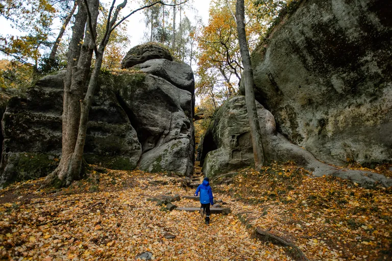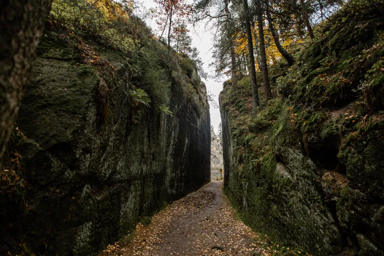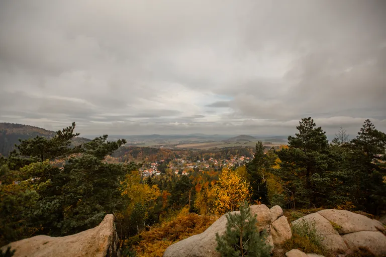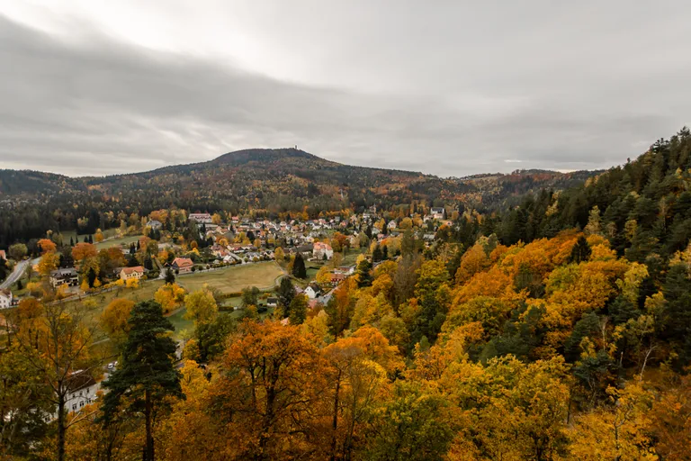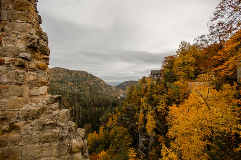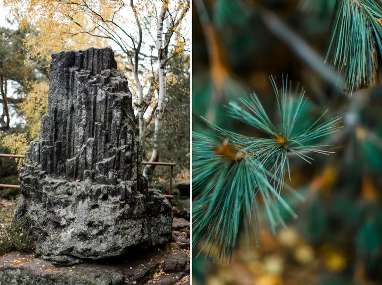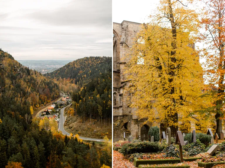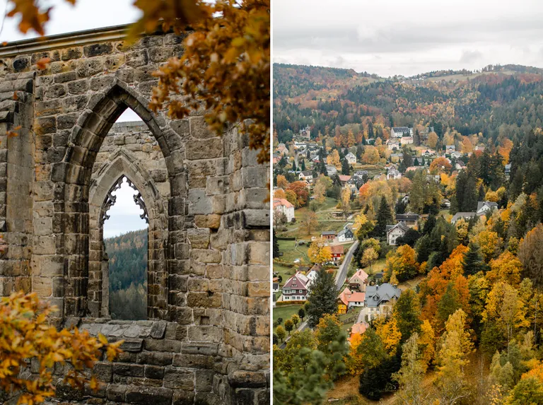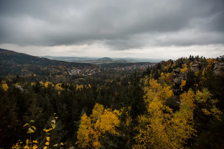 Wir schnürten unsere Wanderschuhe und liefen direkt vor der Haustür los. Durch die Zigeunerwand ging es weiter hoch zum Nonnenfelsen mit einem fantastischen Blick über Jonsdorf. Die Laubfärbung war besonders prächtig und immer wieder blitzten im dunklen Wald gelb gefärbte Blätter hervor. Weiter ging es ein Stück am Grenzweg entlang, ein Abstecher zu den Orgel-Pfeifen-Steinen (Sandstein in Säulenform der durch glühende Lava entstanden ist) und zum Gondelteich in Jonsdorf.