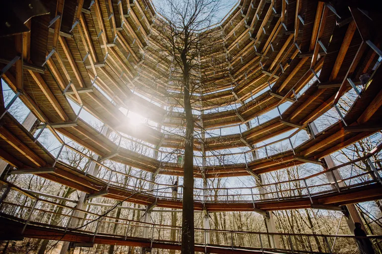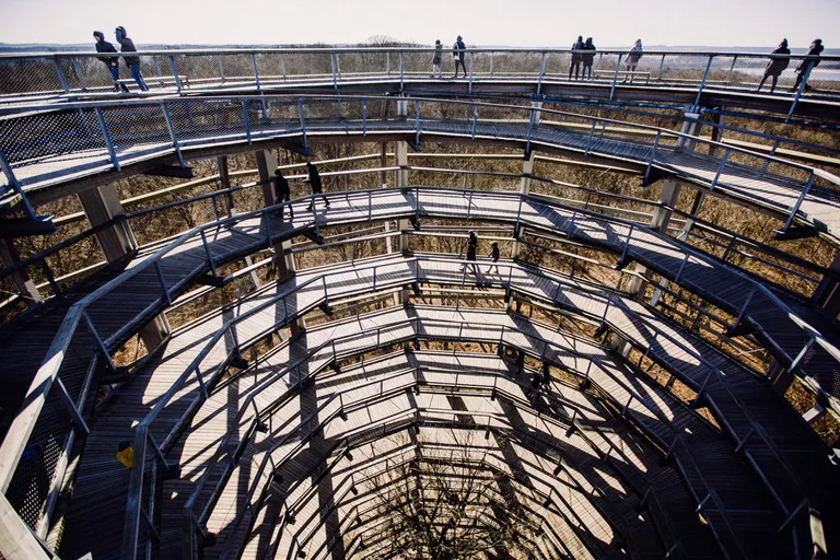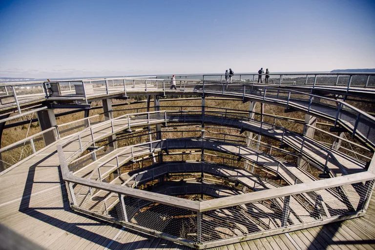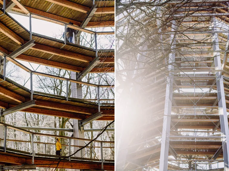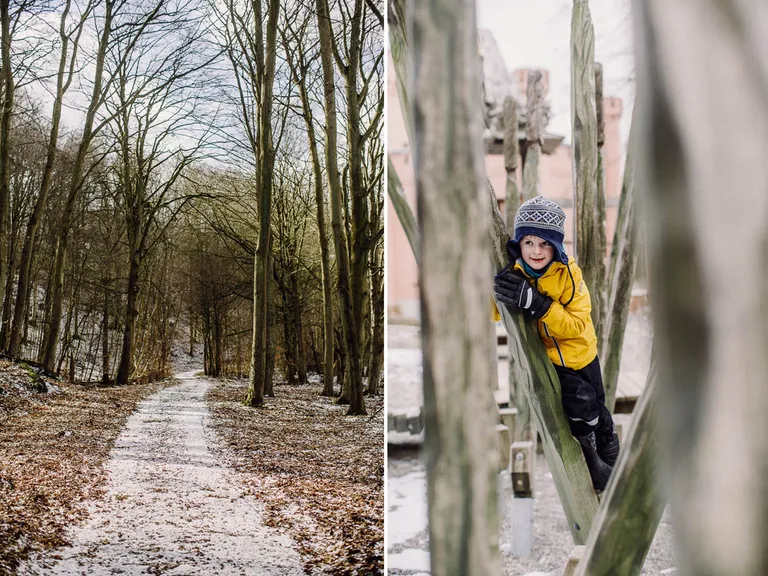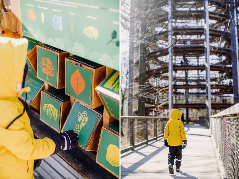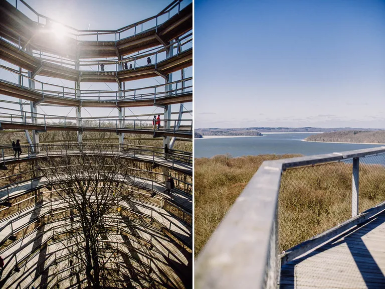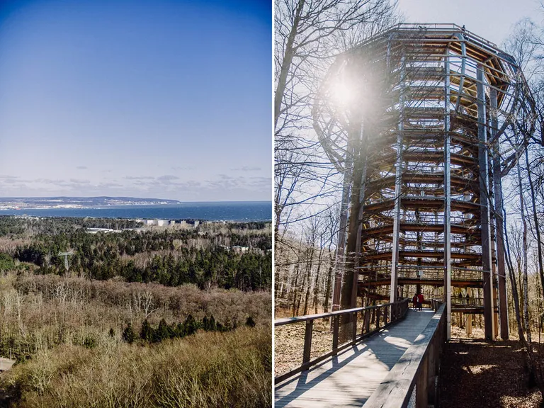 Am Abreisetag zeigte sich ein blauer Himmel und die Sonne schien. Wir beschlossen noch einmal beim Baumwipfelpad in Prora anzuhalten. Diesmal – mit weniger Sturm, aber trotzdem kalten Wind und Sonne – konnten wir den Pfad erklimmen und wurden mit einer tollen Aussicht über Rügen und der Ostsee belohnt. Der Pfad ist komplett barrierefrei und es ist möglich einen Rollstuhl oder Kinderwagen zu nutzen. Wir entschieden uns aber wieder für die Babytragen. Erwachsene zahlen 11 Euro und Kinder unter sechs Jahren sind kostenfrei, danach 8,50 Euro. Für Emil war der Pfad wieder ein großer Spaß, es gab immer wieder kleine Lernstationen zum Ausprobieren und Tafeln mit Informationen über Bäume und Waldtiere.