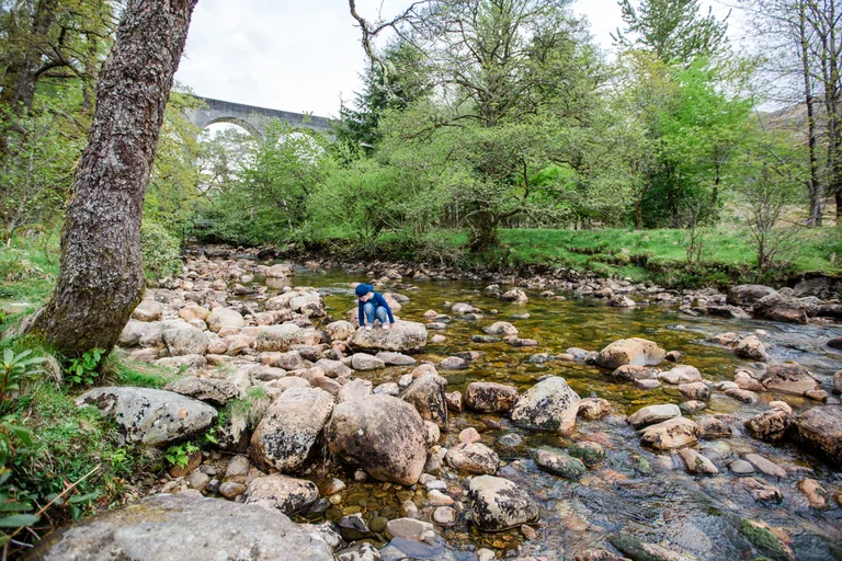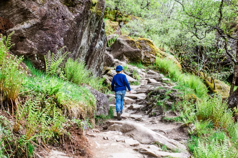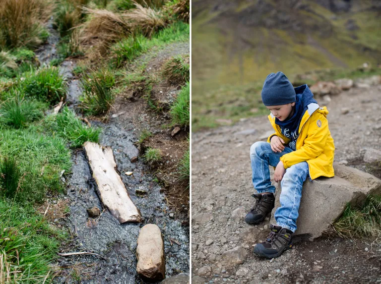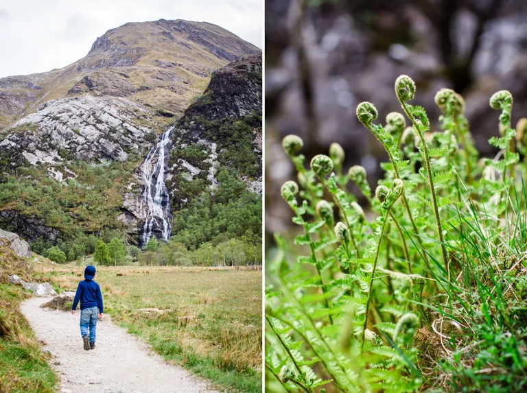 Die Wandertour zum Steall Wasserfall startet man am besten vom letztmöglichen Parkplatz. Dazu fährst du mit dem Auto zu den Lower Falls und auf der C1162 immer weiter bis es nicht mehr weiter geht. Auch wenn gerade kein Parkplatz frei ist, warte einfach einen Moment, es kommen und gehen immer wieder Wanderer. Anton hatte wir in der Trage auf dem Rücken. Festes Schuhwerk und eure Kamera solltet ihr nicht vergessen. Ein wunderschöner, für Kinder spannender Wanderweg führt über Wasserquellen und anspruchsvollen Treppen zum Wasserfall. Um ganz dicht dort hinzugelangen musst du auf dem letzten Stück über den Fluss und das über die "Glen Nevis Rope Bridge", eine Brücke aus drei Seilen. Ein Seil zum darauf laufen und zwei zum festhalten. Wir haben es nicht gewagt, Emils Arme wären sicher auch zu kurz gewesen. Aber nicht so schlimm, uns hat der Blick auf den Wasserfall auch so gereicht und er war wunderschön!