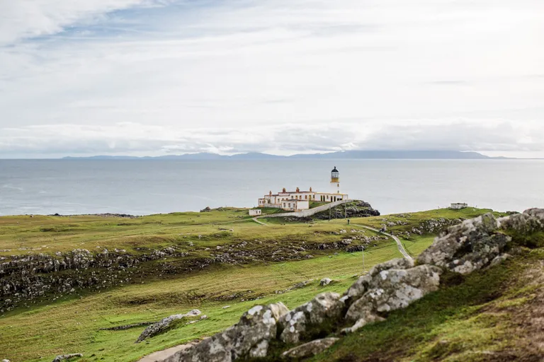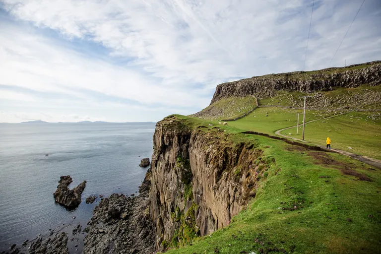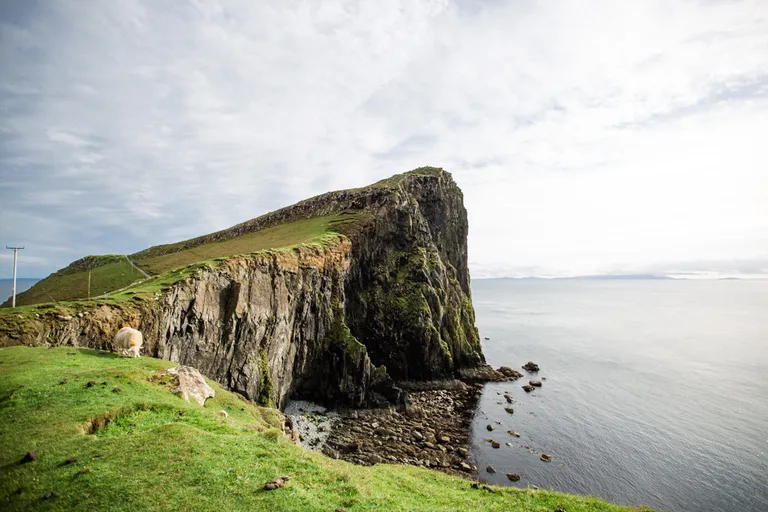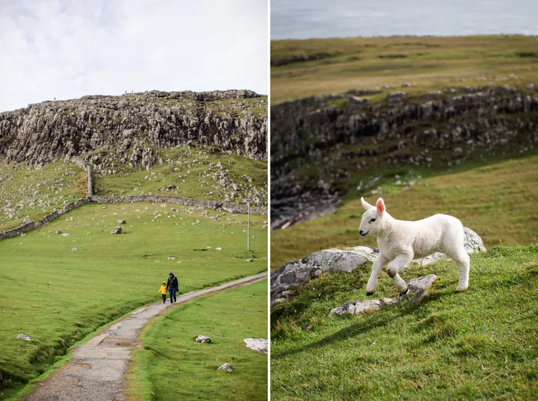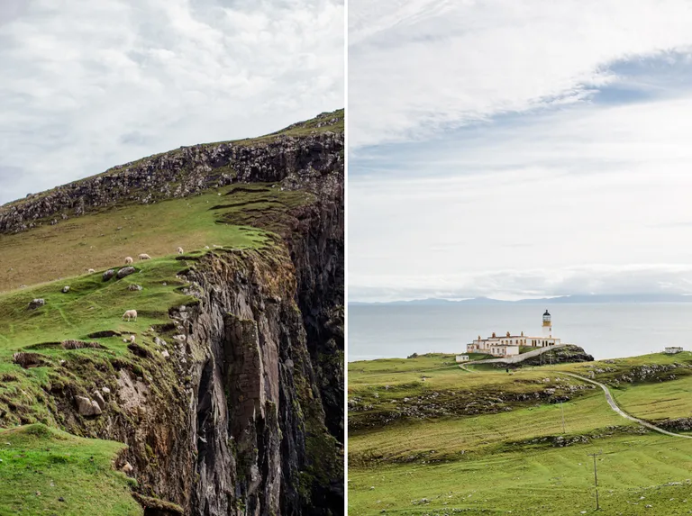 Nachdem es aufgehört hat mit regnen, machten wir uns auf den Weg zum Neist Point Lighthouse am westlichsten Punkt von Skye. Die Straßen auf Skye sind eine Katastrophe. Sehr viele und vor allem tiefe Schlaglöcher und meist so schmal, das nur ein Auto passieren kann und immer nach einer Ausweichbucht geschaut werden muss. Das kann manchmal schon ein bisschen dauern, bis man am Ziel ist. Den Leuchtturm sieht man nicht vom Parkplatz aus. Dafür musst du erst einmal die vielen Treppenstufen herabgehen, die du später wieder hoch steigen musst. ;) Der Leuchtturm befindet sich genau hinter dem großen Hügel. Überall auf den Wiesen springen kleine flauschige Lämmer umher und sind immer ganz dicht bei ihren Mamis. Die sind so niedlich, der Mai ist wirklich eine tolle Reisezeit!