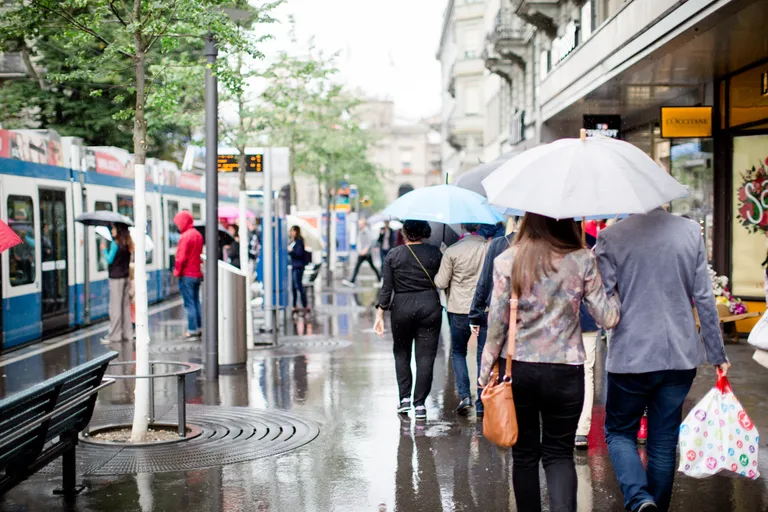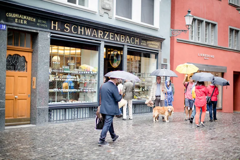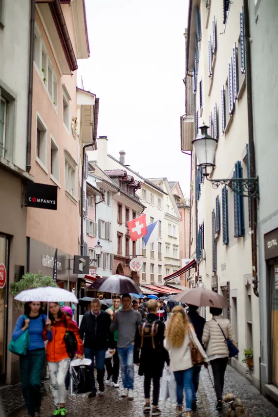 Wir starteten 5:30 Uhr in Chemnitz und fuhren direkt nach Zürich. Wir stellten das Auto im Parkhaus Opéra ab, wo wir für etwa drei Stunden 14 CHF zahlten. Leider fing es genau in dem Moment an zu regnen und es hörte die nächsten drei Stunden auch nicht auf, eher im Gegenteil. Also liefen wir mit Kapuze und Schirm am Zürichsee vorbei Richtung Altstadt. Unser Weg führte am Frauenbad vorbei, wir waren in der Kirche Fraumünster, sind über den Paradeplatz zur St. Peterskirche und durch hübsche kleine Gassen zum Bahnhof gelaufen. Durch den Regen fiel uns die Entscheidung nicht schwer wieder Richtung Parkhaus zu laufen. Wir wollten nur kurz noch in die Kirche Großmünster schauen. So legten wir, wie alle anderen auch, unsere Schirme am Eingang ab. Als wir dann wieder gehen wollten, war Thomas Schirm weg. Einfach weg. Der gute, karierte Automatikschirm. Der Ärger in diesem Moment war groß, es regnete sehr. Also liefen wir schnell mit Emil auf den Schultern und mit nur einem Schirm zum Parkhaus zurück.