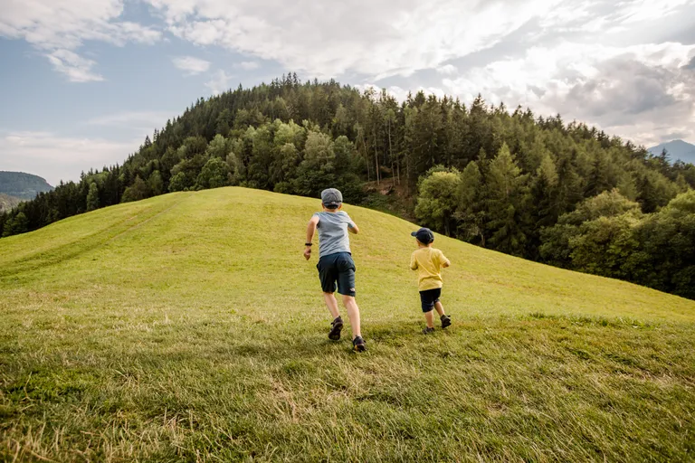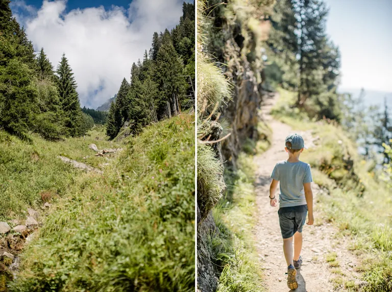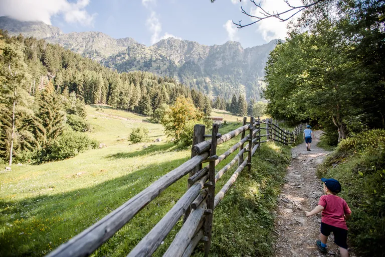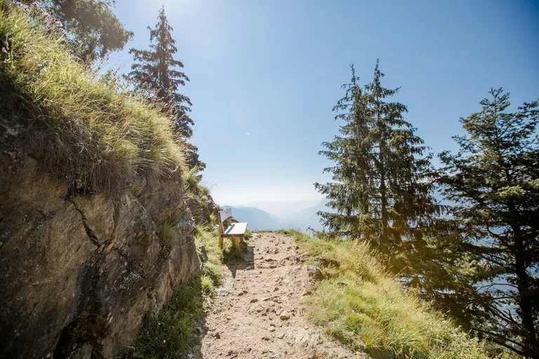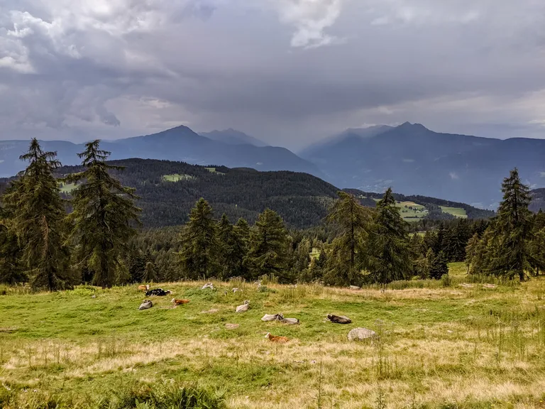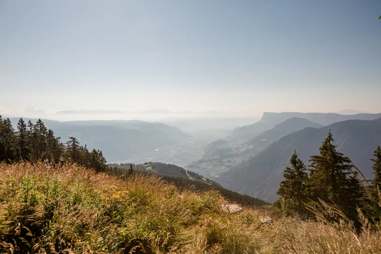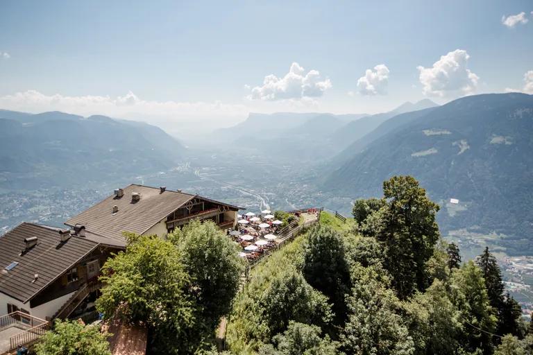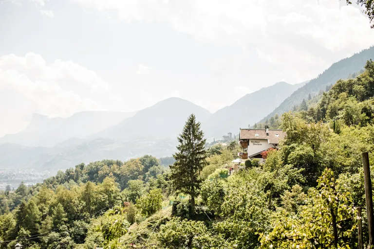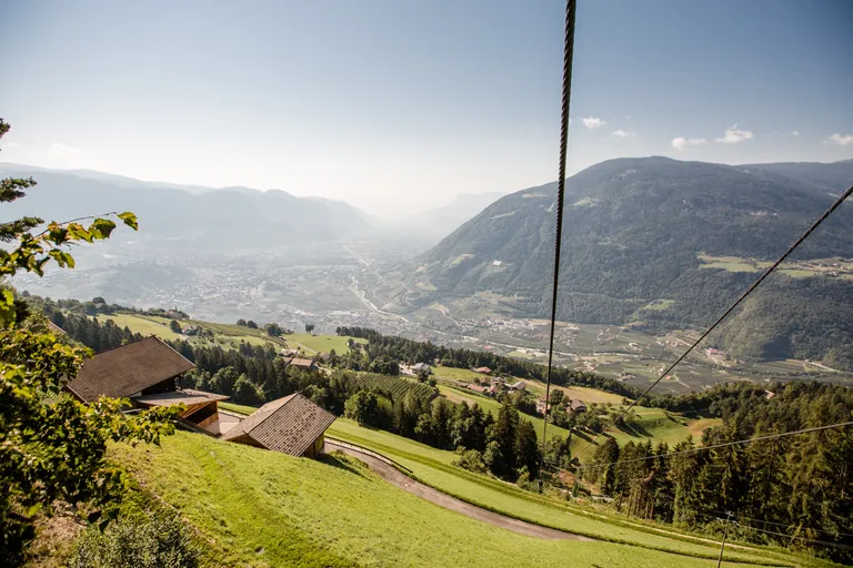 Mit dem Korblift in Vellau sind wir zur "Leiter Alm" auf 1.550 Metern Höhe gefahren. Auf dem Meraner Höhenweg sind wir bis nach Hochmuth zum "Gasthaus Steinegg" gewandert und über den Vellauer Felsenweg wieder zurück zum Parkplatz.