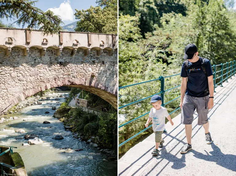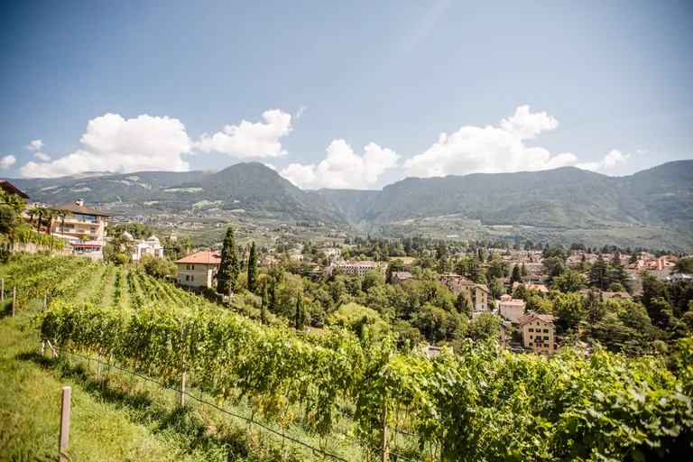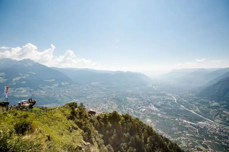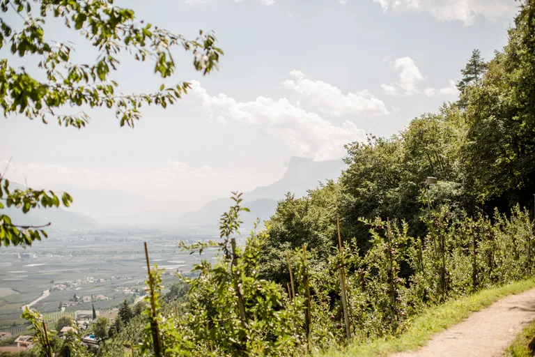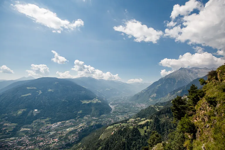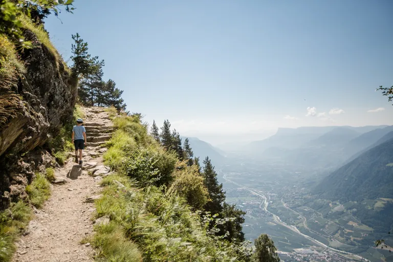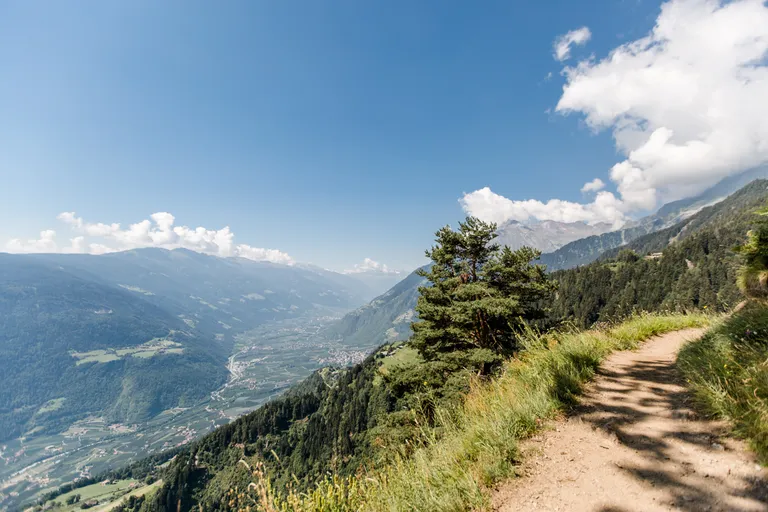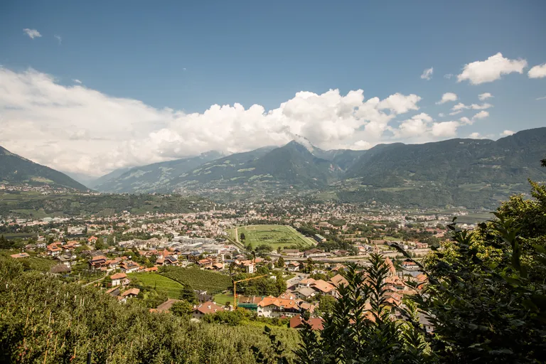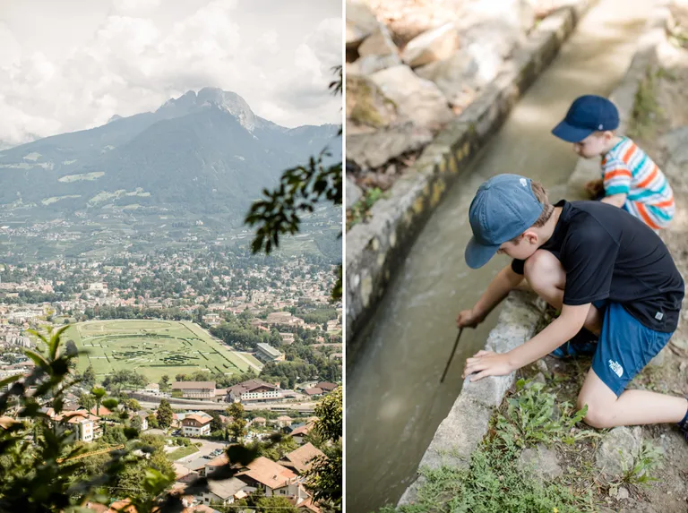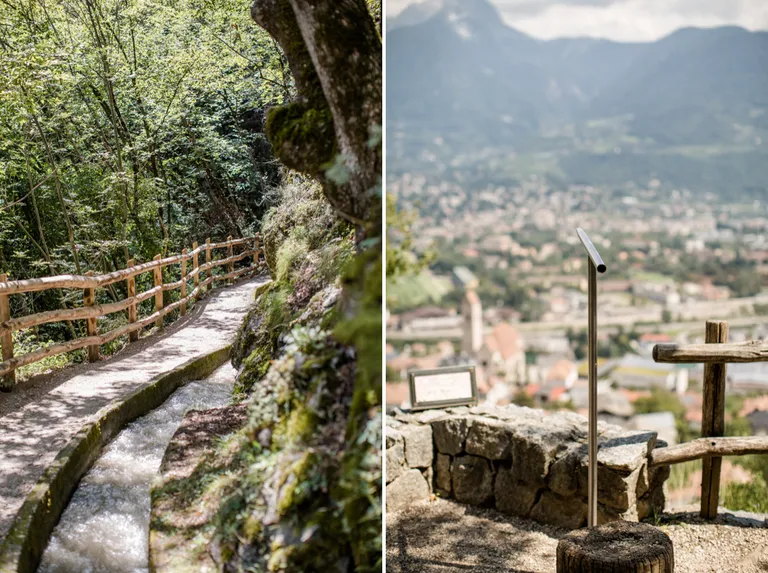 Einen herrlichen Blick auf das Meraner Becken hat man vom 12km langen Marlinger Waalweg. Einfach zu laufen und direkt neben dem Waal. Waale sind vom Menschen angelegte Bewässerungsgräben, die Wasser aus den Bergen zu trockenen Fluren bringen.